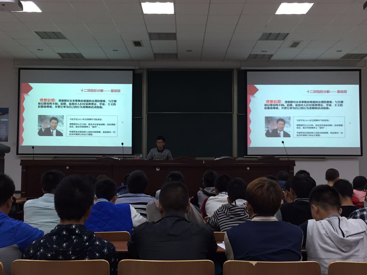 随后辅导员顾悦向同学们阐述了十二项核心素质能力分为基础层、核心层、拓展层。基础层包括理想信仰、责任意识、诚信意识、文明礼仪 ,再是核心层,重点还是学习能力,学会老师教的知识,学会学习的方法,学会观察与总结 (绩点不到2.0 拿不到学位证) ,表达能力、创新能力、求是精神也是如今大学生必备的素质。拓展层包括,国际视野,掌握一门甚至两门外语也是很重要的一环。拓展层还包括包容气度、体艺素质、法律素质。