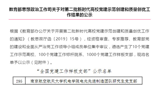 12月12日,教育部思想政治工作司公示了第二批新时代高校党建示范创建和质量创优工作结果,我院首个在课题组建立的纵向党支部——电光先进制造团队研究生党支部荣获“全国党建工作样板支部”。