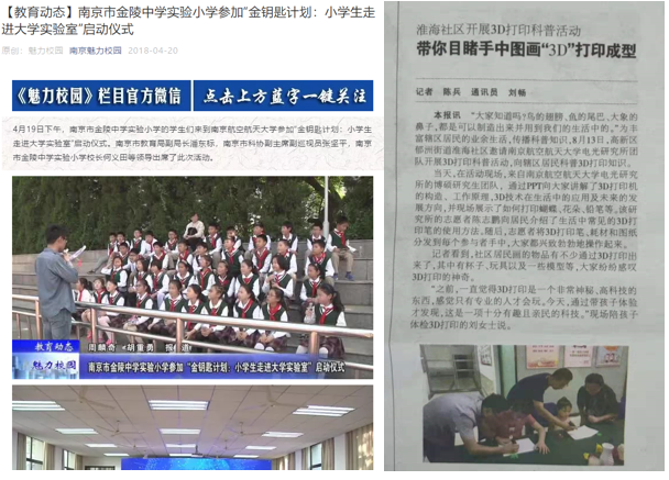 电光先进制造团队党支部结合3D打印等研究领域,发挥学科特色优势,打造团队特色活动——3D打印STEAM创新教育公益活动,目前已成功申请为校园文化精品项目。团队党员积极参与其中,积极地把自己在专业方面的所学所思所想用通俗易懂的语言传授给中小学生,受到了社会各界的热烈反响,获得了南京电视台、连云港日报等多家主流媒体的报道!用实际行动向社会各界展示了南航学子的优良素质,诠释了新时代学生党员的社会担当意识!