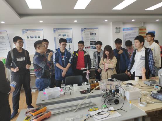接下来,王尧尧老师带领同学们来到了多体系统实验室继续参观。王尧尧教授和两位研究生学长生动地介绍了他们的科研项目:水下机器人,绳驱动机器人系统,非线性鲁棒控制。实验室中神通广大的机械臂引起了参观同学们的兴趣,王尧尧老师解释道:“机械臂结构中包含了很多我们学过的知识,比如最简单的机械运动副,传动装置,控制系统等,而且应用场景很广泛,我们研制的很多机器人都是带有机械臂的,无论在工厂里还是水下,带有机械臂的机器人都大有用处。”