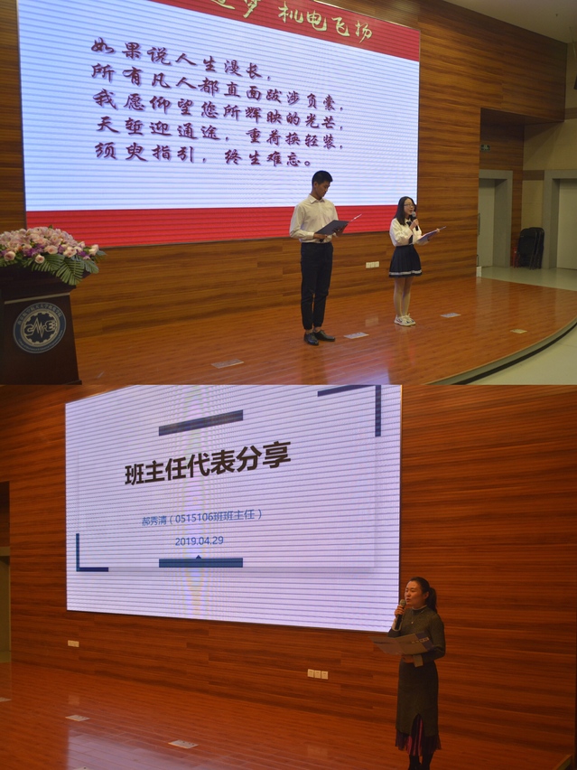 18级学生司马怡聃独立创作的诗朗诵《老师,我想对你说》表达了机电学子对广大老师们的感激、爱戴和真挚的祝福。随后,班主任代表郝秀清老师通过她与0515106班学生的故事,从班主任与辅导员的区别、什么时候应该联系班主任、班主任可以为学生提供哪些帮助三个方面阐述了她对“班主任”这一身份的理解和感悟,展现了班主任对班级同学成长成才的殷切期望。