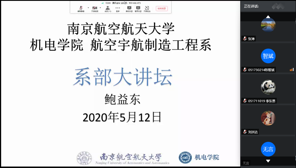 为进一步扩大学科影响,提升半岛体育 研究生生源质量,营造浓厚的深造氛围,4月20日到5月12日,半岛体育官网 2017级成功开展了4次线上系部大讲堂活动。本次大讲堂活动邀请到了设计工程系副主任郭勤涛、机械制造及其自动化系副主任丁文锋、机械电子工程系副主任陆永华和航空宇航制造工程系副主任鲍益东作为主讲人,采用线上会议的方式为我院学生介绍科研团队、研究方向等内容。本次系列活动由2017级本科生辅导员刘洪达主持。