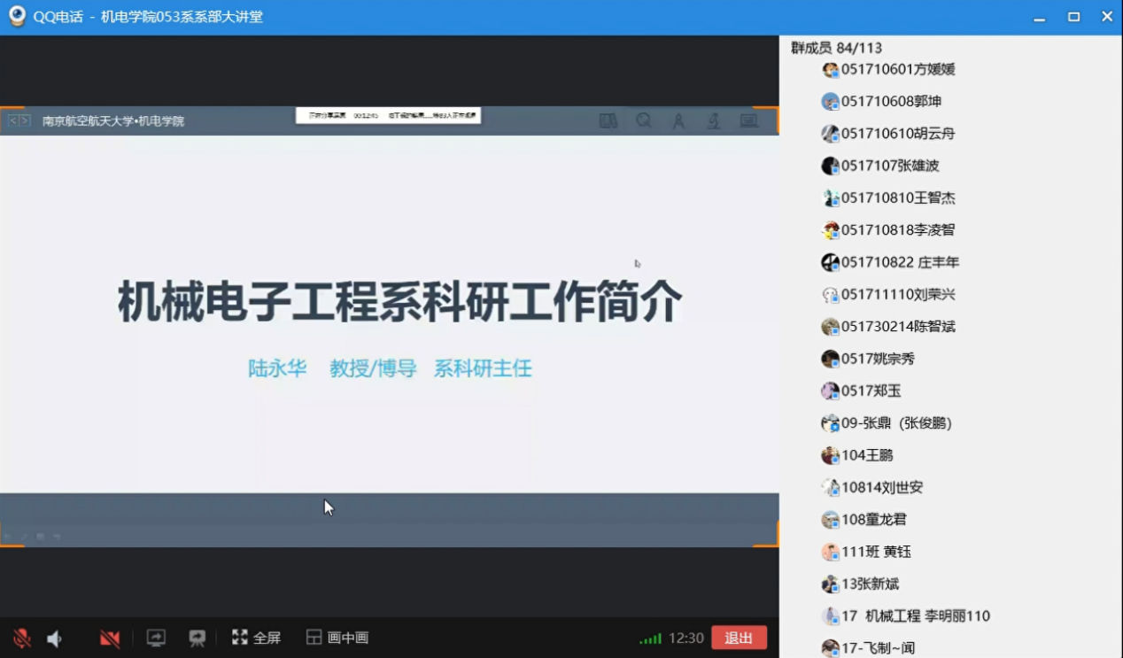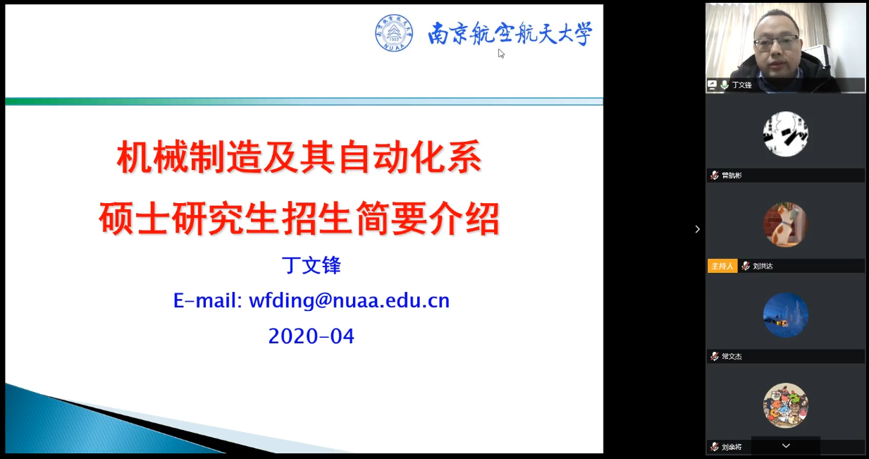 为进一步扩大学科影响,提升半岛体育 研究生生源质量,营造浓厚的深造氛围,4月20日到5月12日,半岛体育官网 2017级成功开展了4次线上系部大讲堂活动。本次大讲堂活动邀请到了设计工程系副主任郭勤涛、机械制造及其自动化系副主任丁文锋、机械电子工程系副主任陆永华和航空宇航制造工程系副主任鲍益东作为主讲人,采用线上会议的方式为我院学生介绍科研团队、研究方向等内容。本次系列活动由2017级本科生辅导员刘洪达主持。