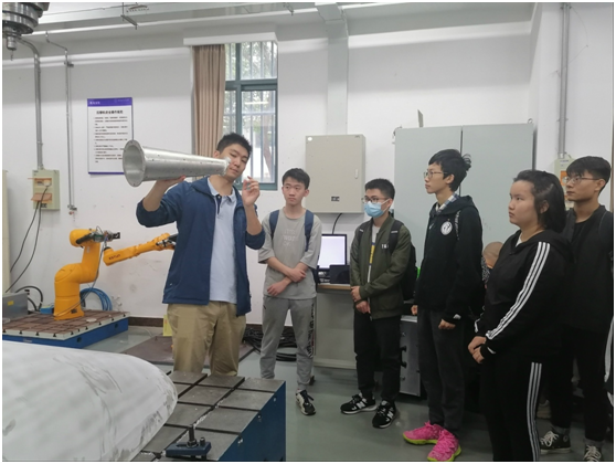 随后,同学们前往参观航空航天机器人智能装配技术实验室。航空航天装配的难题在于飞行器部件十分庞大,普通的机床难以满足其庞大尺寸。使用机器人搭载铣刀进行零件加工更具有灵活性和经济性,但是机器人长度较长,刚度较差且为串联结构,加工精度较低。为攻克相关技术难题,实验室团队自行改装了大型KUKA机器人,在转轴上加装光栅尺精确捕捉机器人转动角度,机器人和零件上粘贴靶标点,通过机器成像完成精准尺寸测量,可实现高精度加工任务。实验室团队还在全向移动的AGV小车上安装机器人,AGV小车可将机器人运送到指定加工位置进行测量、加工、装配等任务,解决了航空航天大部件装配难、装配效率低的问题。