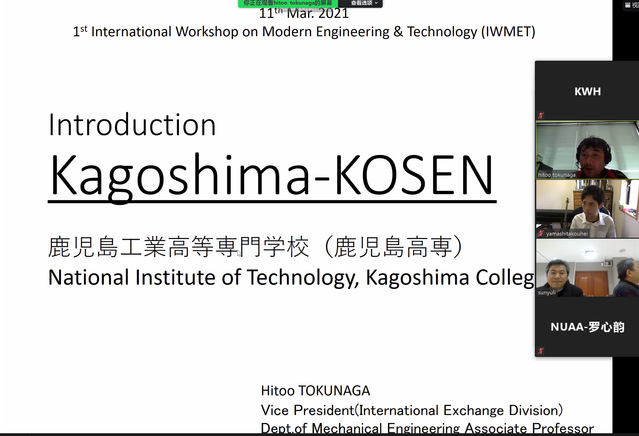 3月11日上午,“1st International Workshop on Modern Engineering & Technology (1st IWMET)”线上本科毕设答辩会议在明故宫校区15号楼341会议室举行。日方参加此次会议的主要人员有:分管国际交流的副校长H. Tokunaga教授及K. Shimana教授、Y. Kobaru教授、Y. Kawano教授等,本科生Tomoyuki Hirotani和Kouhei Yamashita等10余人;我院参会的主要人员有:左敦稳教授、孙玉利教授以及部分研究生、大四年级本科生10余人。会议由日本鹿儿岛工半岛体育 副校长Hitoo Tokunaga教授主持。