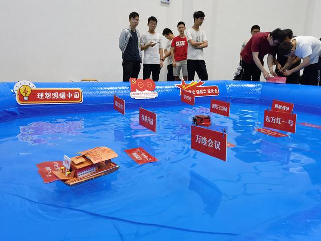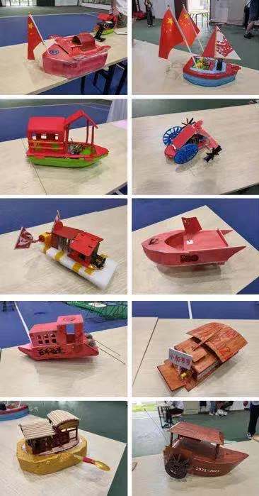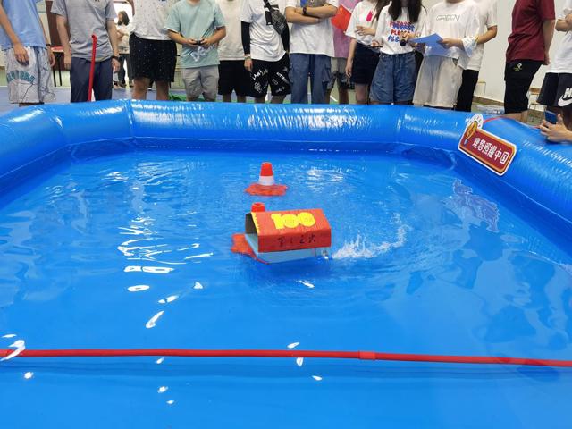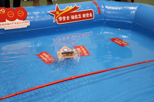 在竞速赛和创意赛中,参赛队伍将知识学以致用,齿轮、马达、连杆等零件精密组合,自主设计制作遥控龙舟,在规定的水池赛道中竞速争先。队员们的参赛作品以红船为主题,设计巧妙,匠心打造,兼具结构和外观之美,涵盖建党百年元素,赢得评委们的一致好评。小小的一片水池,因为汇聚了一艘艘红船航行而变得不再平静。