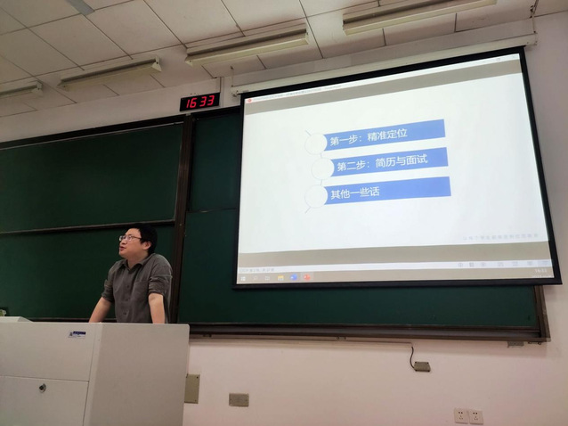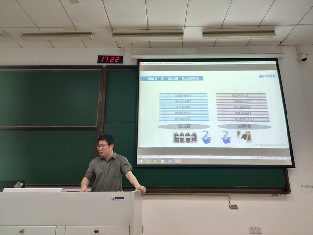 讲座伊始,曹克楠从学生们较为感兴趣的上届应届生一年离职率的话题切入,和同学们探讨了应届生选择离职的主要原因。随后为同学们指出了就业入门应该关注的三个最重要的问题,即行业发展前景、行业友好程度和行业的上限和下限,接着和同学们分享了一份好工作的标准:从薪资待遇方面来说,着重关注薪资加速度和三年工资和;从工作量方面来说,着重关注创造性和核心竞争力;从地域选择方面来说,着重关注地区机遇及个人选择。随后曹克楠老师提出面试过程中HR最关注的三个问题,即能力匹配,团队协调,职业稳定三个方面,并就自身面试应届生经历对三个方面详细举例。