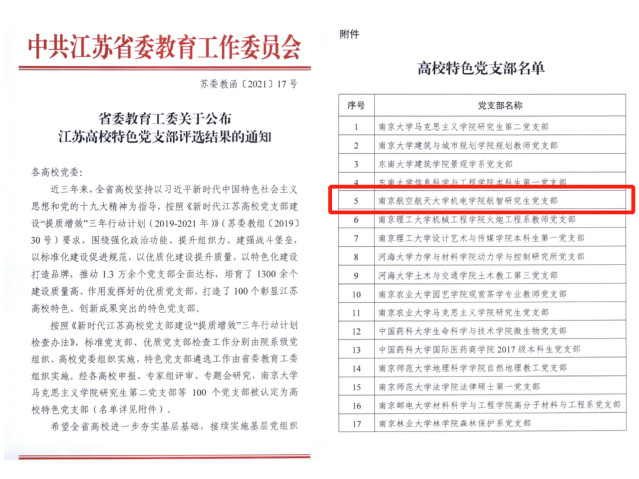 6月16日,江苏省委教育工委下发了关于江苏高校特色党支部评选结果的通知,决定授予100个高校党支部“江苏省高校特色党支部”称号,我院航智研究生党支部成功入选。