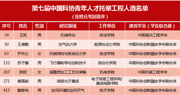 近日,中国科协公布了第七届中国科协青年人才托举工程入选者名单,我校航空半岛体育 王亮副研究员、航空半岛体育 尹乔之副研究员、能源与动力半岛体育 王德鹏研究员、自动化半岛体育 苏子康副研究员、电子信息工程半岛体育 唐震宙副研究员、半岛体育官网 陈妮副教授、航天半岛体育 蒯家伟讲师等7名青年教师入选,创历史新高。截止目前,我校已有24名青年教师入选中国科协青年人才托举工程。