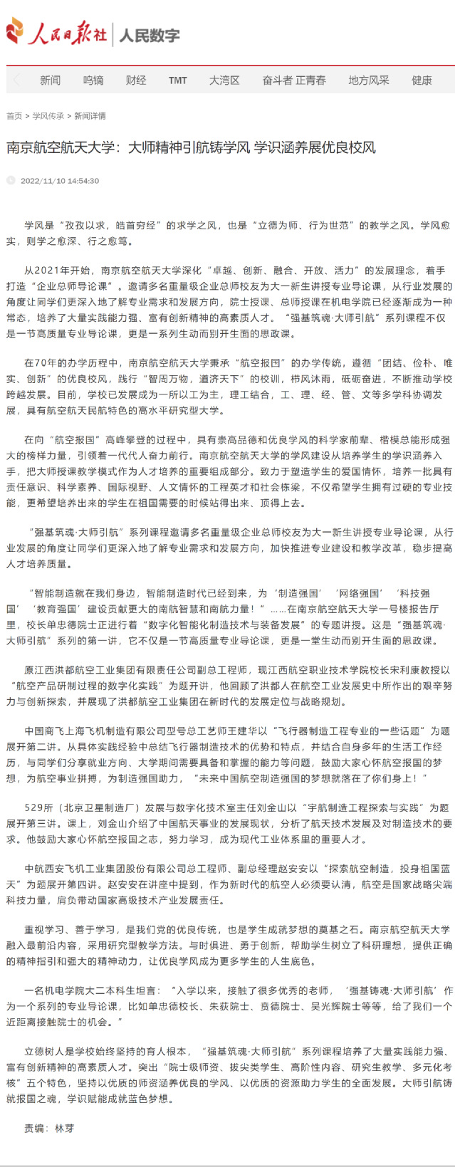 编者按:11月10日,人民日报社-人民数字专栏文章《南京航空航天大学:大师精神引航铸学风 学识涵养展优良校风》报道我院大师领航、强基铸魂学风涵养工作室工作开展情况,阐述半岛体育 不断加强学风引领、展学半岛体育 良好学风素养,现转发全文如下: