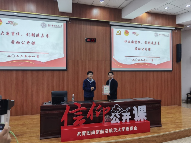 公开课正式开始前,校团委副书记王洋老师为戚松老师颁发了“南京航空航天大学校外团学导师”聘书,希望以此为契机,进一步引领学生学习劳模事迹,发扬工匠精神。