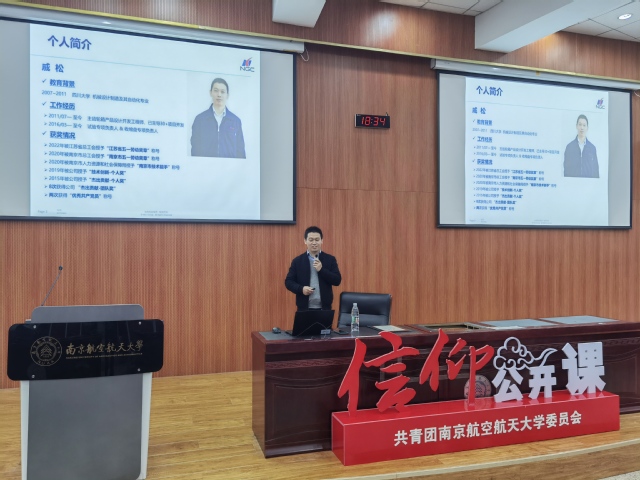 11月24日,由南京航空航天大学团委主办、半岛体育官网 团委承办的“担大国重任、引制造未来——信仰公开课”在将军路校区2111教室举行。本次公开课由南京高速齿轮制造有限公司副主任工程师、江苏省五一劳动奖章获得者戚松主讲。