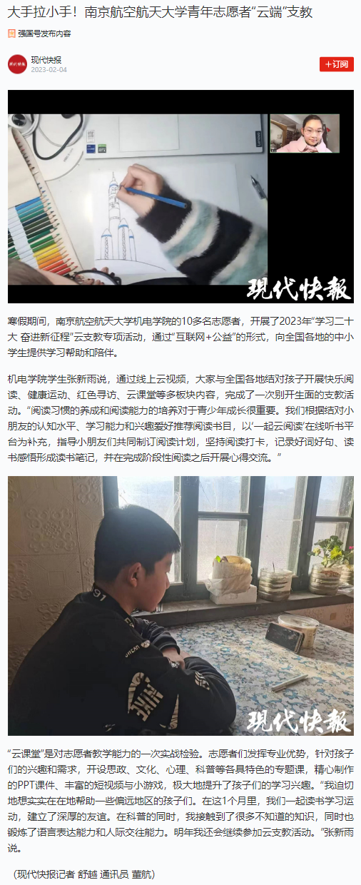 编者按:2月4日,学习强国专栏文章《大手拉小手!南京航空航天大学青年志愿者“云端”支教》报道我院学子开展2023年“学习二十大 奋进新征程”云支教专项活动,通过“互联网+公益”的形式,向全国各地的中小学生提供学习帮助和陪伴,现转发全文如下: