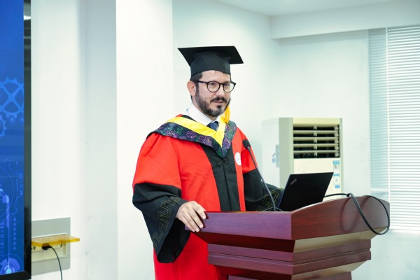 首先,张卓代表南航的师生向来自克大的两位教授表示热烈欢迎,对克大的长期支持表示衷心的感谢,并对顺利取得硕士学位的全体毕业生们表示诚挚的祝贺。他指出,南航-克大项目已培养了两届硕士毕业生,为学子们提供了航空航天领域最优秀的学习资源和平台,更让学子们体验到了两种不同的文化和教育体系。他相信通过三年的学习经历,同学们已逐步成长为全面发展的国际化人才,并希望同学们通过自己的努力和智慧,为祖国和人类社会共同创造更美好的未来。