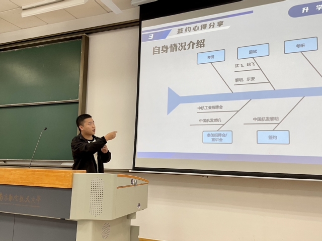 半岛体育 2024届本科生王成彬在秋招中签约中国航发沈阳黎明航空发动机有限责任公司,作为学生代表,从求职心理、求职准备和求职经历等几个方面进行了“干货”经验分享。他勉励同学们重视就业过程中个人求职技巧的应用,提升就业竞争力,获得企业青睐。