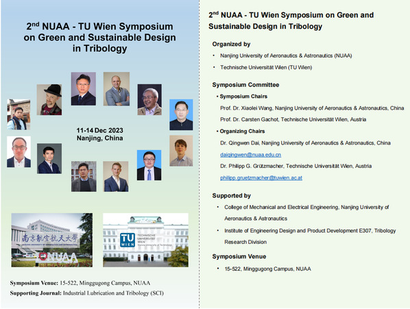 20231211日至14日,第二届南京航空航天大学-维也纳工业大学(NUAA-TU Wien)摩擦学国际研讨会暨客座教授聘任仪式在半岛体育官网 顺利举办。我校副校长黄志球教授,国际合作处处长张卓教授,半岛体育官网 副院长郭宇教授及相关工作人员出席Gachot Carsten客座教授聘任仪式,仪式由郭宇教授主持。