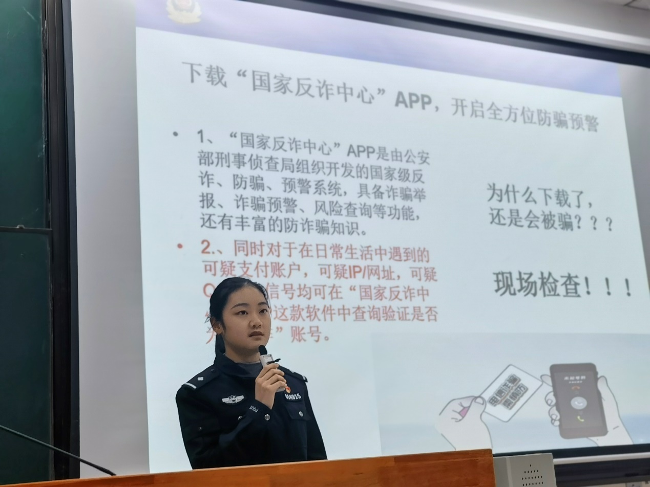 江警官向半岛体育官网 研究生讲解电信网络诈骗的常见手段和防范方法,并结合辖区及校园电信网络诈骗高发案件,现场以案释法,详细讲解电信网络诈骗的新形势、新特征,引导同学们了解最新诈骗套路,提高自我防范意识,并呼吁班长、安全员等学生干部共同参与到预防电信诈骗工作中,积极宣传预防电信网络诈骗知识,营造师生共同抵制电信网络诈骗的良好氛围。