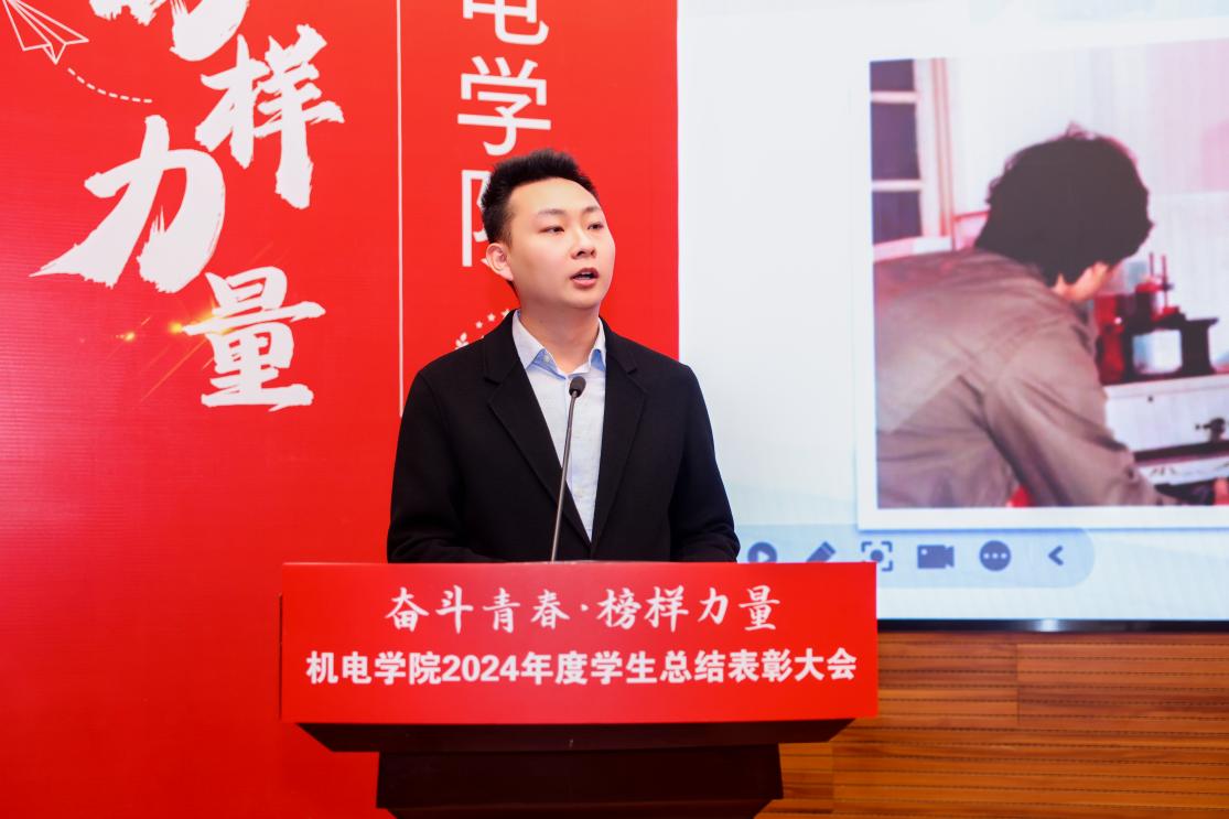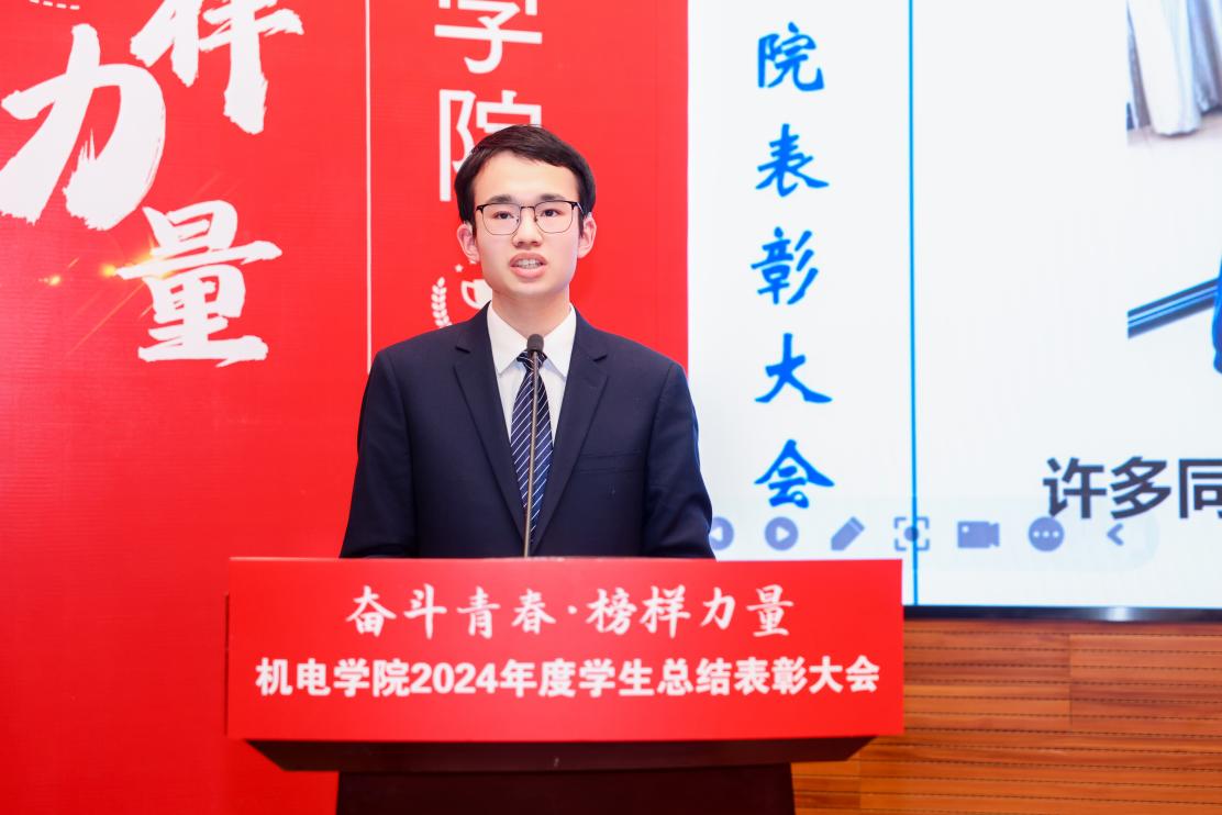 最后,刘虎对本次表彰大会致辞。他表示,今天的表彰大会,不仅是一场朋辈引领的榜样事迹分享会,更是一堂筑梦育人的思政公开课。他对同学们提出了三点要求:要坚定理想信念、厚植家国情怀,要坚持科技创新、练就过硬本领,要矢志拼搏奋斗、勇担时代重任。他强调,新时代呼唤新作为,新征程须有新担当,希望机电学子在推进强国建设、民族复兴伟业中展现青春作为、彰显青春风采、贡献青春力量。
