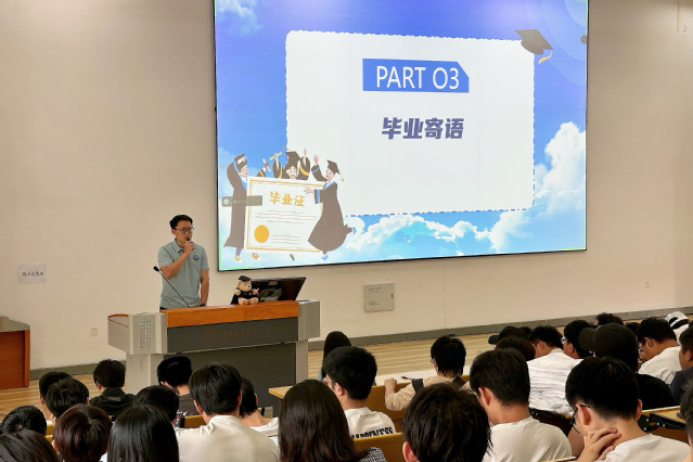 最后,辅导员王曦聚焦爱校荣校、浸润感恩,引导同学们回顾成长历程,激发学生对母校师长的感恩之情,用实际行动报答母校的培育之恩。同时,他鼓励学生树立远大理想、永葆奋进底色,到祖国最需要的地方去建功立业,争做新时代的“追光者”。