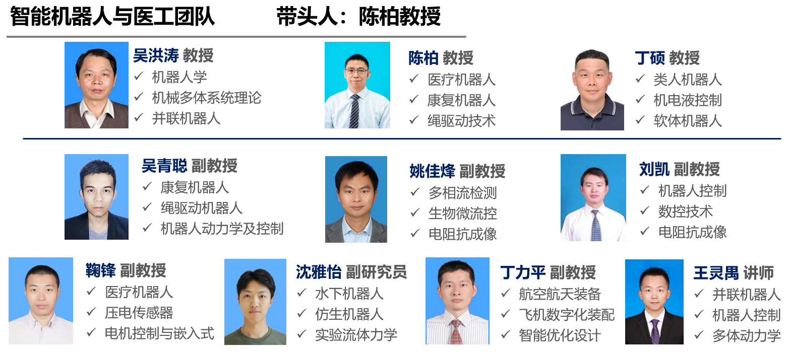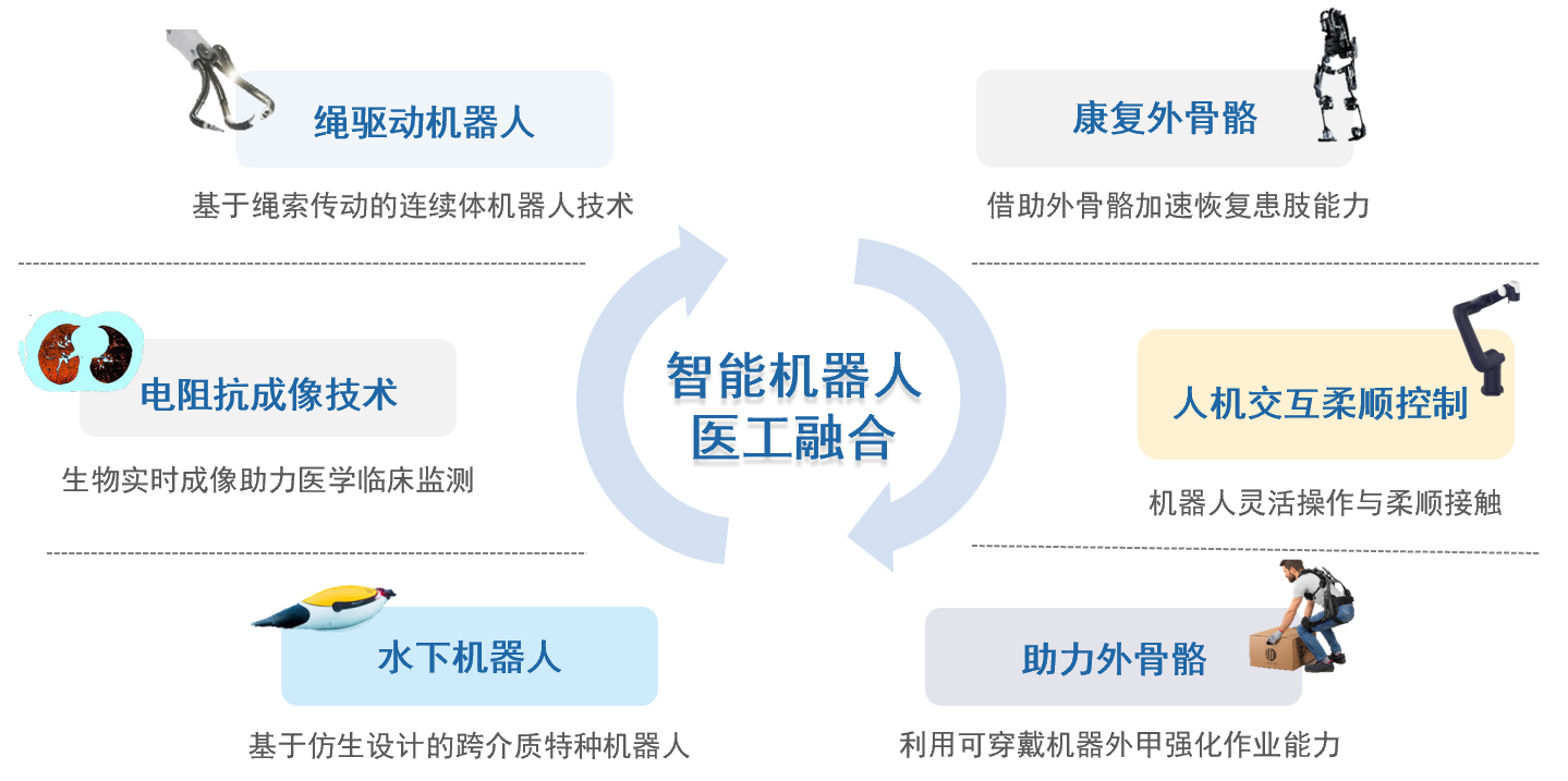 绳驱动机械臂;康复外骨骼技术;类人机器人技术;智能电阻抗检测技术;机器人系统驱动与控制技术;水下仿生机器人技术等。